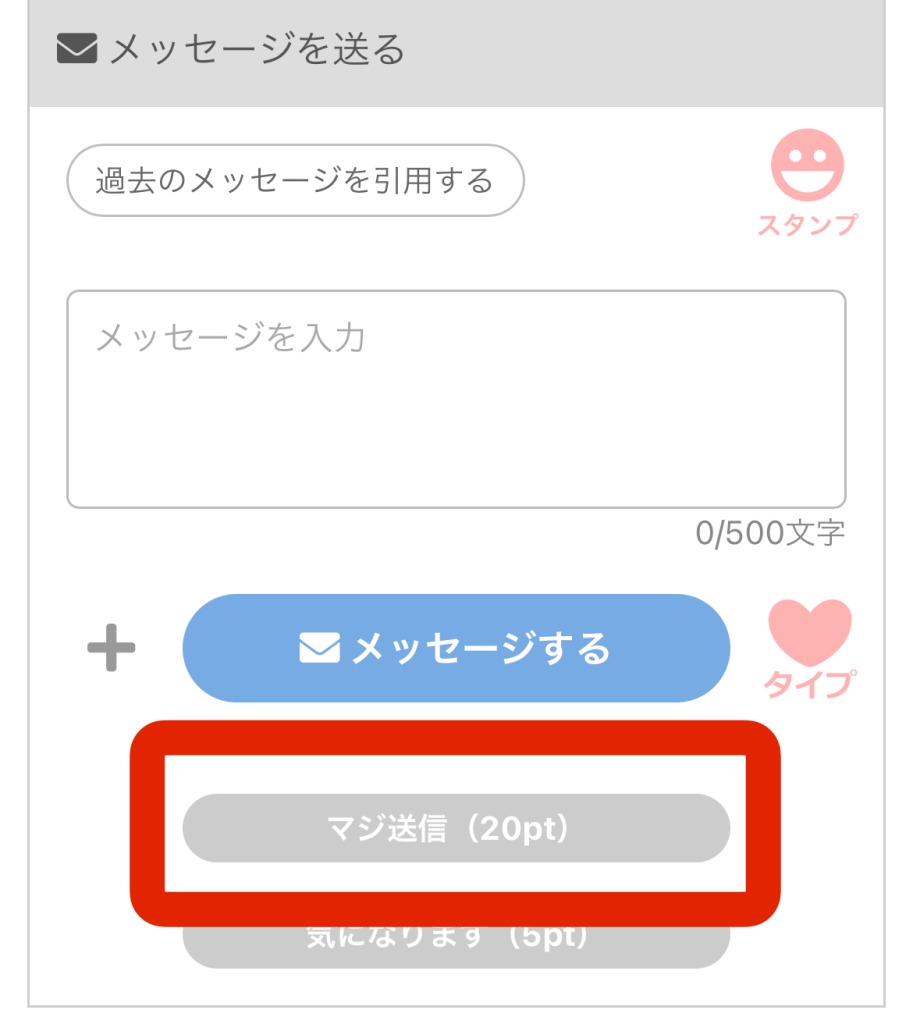 通常のメッセージは5ポイントで50円に対して、マジ送信は200円かかるわけですから。